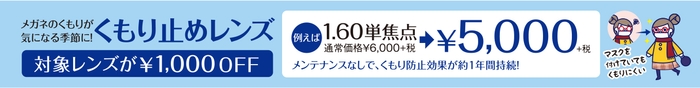 くもり止め機能付き対象レンズが1,000円OFF!マスクの装用や寒暖差でメガネのくもりが気になるこの季節、くもり止めレンズで快適な毎日を!
