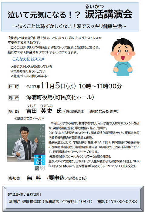 通称「なみだ先生」として、企業・自治体・教育機関・医療機関・福祉施設向けの「涙活」講演などを手がけている、感涙療法士の吉田英史は、2025年11月5日(水)に深浦町健康推進課主催で深浦町役場町民文化ホールで「涙活(るいかつ)」講演を実施します。涙の効能やストレス解消法の講義、泣ける映像の視聴を通じて、参加者に涙活を体験してもらい、泣きやすい体質づくりを目指します。