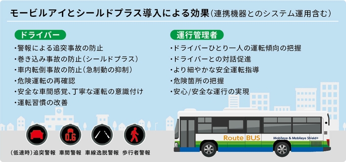 モービルアイ製品は、主として前方の追突事故を防ぐ「追突警報」「低速時追突警報」「車間警報」「車線逸脱警報」「歩行者警報」の5つの警報を備えた衝突防止補助システム「モービルアイ」と、これらの警報機能に加えて、側面に歩行者や自転車が衝突する危険を検知した際に警告する機能を備えた側方衝突警報システム「モービルアイ・シールドプラス」があります。路線バスに向けた安全装置がほとんど無いなか、J21では、これら運転支援のための製品を通して、街中における追突事故の削減や、死亡事故に繋がりかねない交差点での巻き込み事故の撲滅に寄与できると考えています。