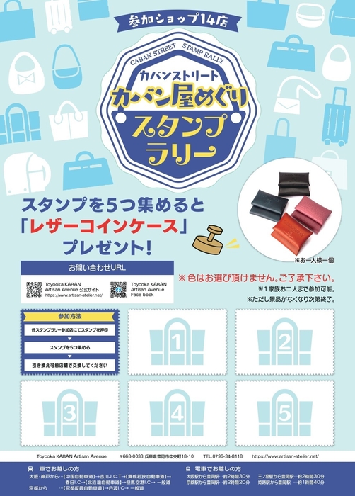 カバンストリート周辺を巡り、スタンプラリー参加店の店内にあるスタンプを集めてください。スタンプが5個たまりましたら、マップに記載の引き換え店舗にスタンプ台紙をお持ちください。レザーコインケースをプレゼントいたします。