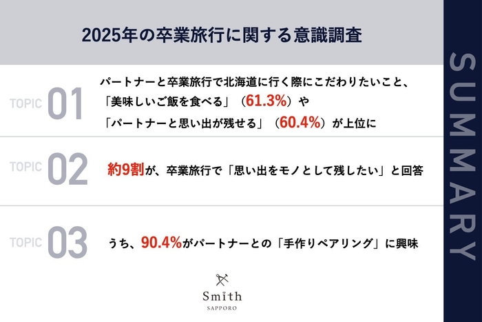 株式会社 一宝(本社:北海道札幌市、代表取締役:懸谷 正人)が運営する、手作り結婚指輪・婚約指輪・ペアリング専門店「工房Smith札幌」は、パートナーと卒業旅行で北海道に行く予定がある学生106名を対象に、2025年の卒業旅行に関する意識調査を実施しましたので、お知らせいたします。
