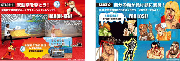 ストリートファイターの名物シーンを体験できる、本展覧会オリジナルコンテンツにも注目。波動拳を撃って車を壊すことができる夢のボーナスステージ体験や、ストIIのキャラクターになりきって負け顔を体験できるコンテンツが登場。対戦型ゲーム筐体で懐かしのゲーム体験や、最新作の『ストリートファイターV』を体験できるなど、ストリートファイターの全てを体感することができます。