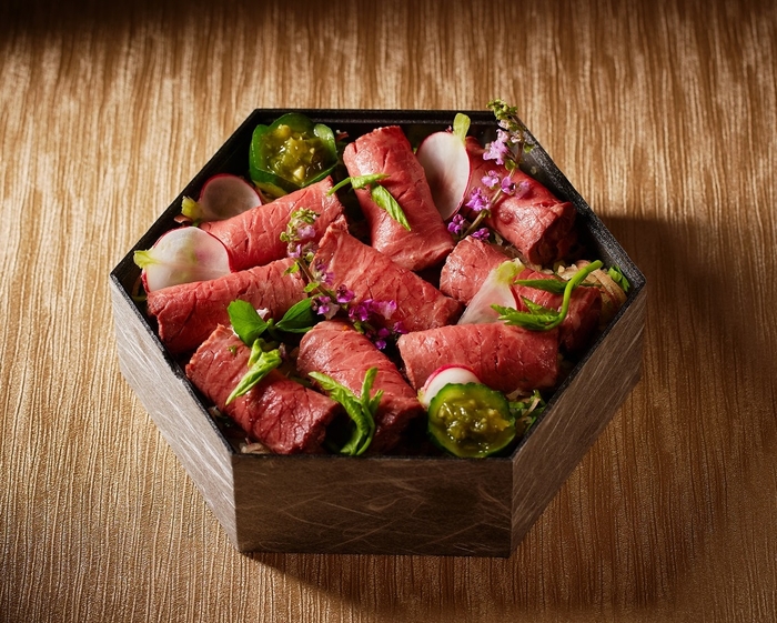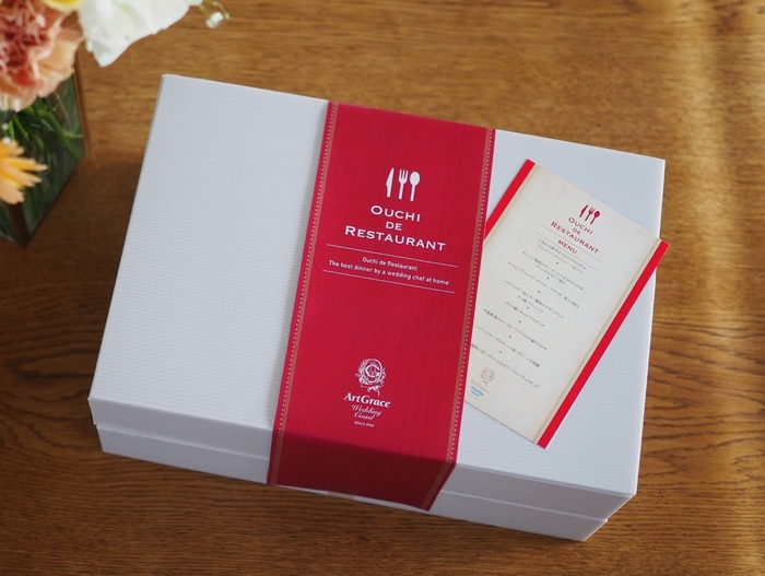 メインのお料理では結婚式でも人気の「しあわせ絆牛」を使用。黒毛和牛の特徴であるサシと脂質にくわえ、ホルスタインの赤身のうまさをかねそなえた、ハイブリッドな牛肉をフォアグラと組み合わせています。メイン含む前菜やバケット等8品をテイクアウトボックスでご用意。お誕生日や還暦祝いなど、家族で集まる特別な記念日のお祝いや、お土産にも最適のこちらのボックスは、ぜひお気に入りのお皿に盛りつけてお楽しみください。