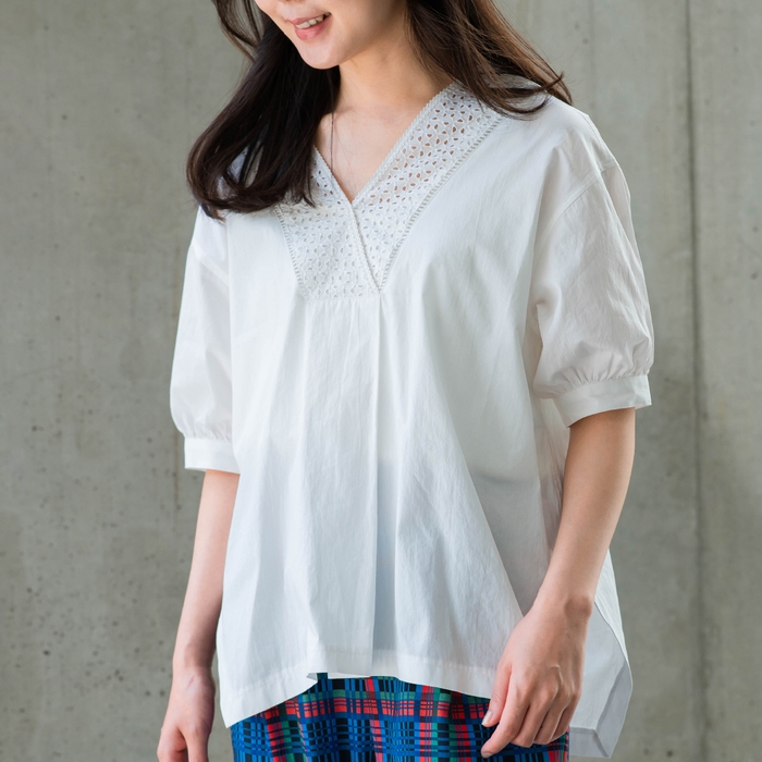 Vネックの襟に施した刺繍レースが女性らしく、一枚でサマになるブラウス。甘めのディテールでも、上品な刺繍レースがガーリーになりすぎず、デニムやカジュアルなボトムスと合わせても相性抜群です。程よいギャザーパフスリーブの短めの袖が初夏にぴったりなデザインです。