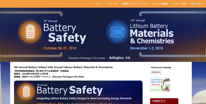会議:「9th Annual Battery Safety/14th Annual Lithium Battery Materials & Chemistries-第9回電池安全性会議/第14回リチウム電池材料・化学会議」