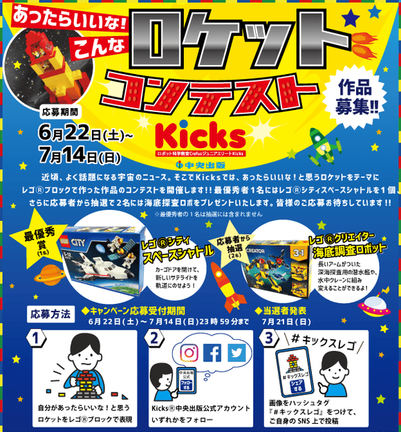 中央出版株式会社(名古屋市名東区、代表:前田 哲次)が運営するロボット製作×プログラミング×STEM教室の「Kicks」は、SNS公式アカウントにおいてレゴ(R)シティ スペースシャトル、レゴ(R)クリエイター 海底調査ロボットが当たるキャンペーンを2019年6月22日に開始します。