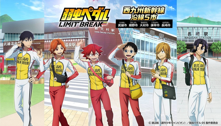 株式会社トムス・エンタテインメント(本社:東京都中野区 代表取締役社長:竹崎忠)は、現在シリーズ第5期放送中のテレビアニメ『弱虫ペダル LIMIT BREAK』と、西九州新幹線開業に合わせたイベントを展開中の沿線5市(佐賀県武雄市、嬉野市、長崎県大村市、諫早市、長崎市)との、コラボ企画の為に描き下ろされた、オリジナルイラストを使用した「弱虫ペダル LIMIT BREAK 西九州新幹線沿線5市コラボ」の新商品を発売いたします。インターハイで活躍中の総北高校レギュラー6人の他、沿線5市の名勝地や名産と共演したミニキャラ20人のオリジナルイラストの初の商品化です。
