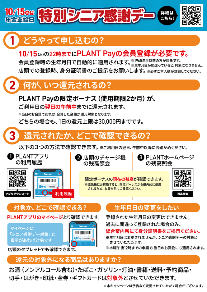 株式会社PLANT(本社:福井県坂井市 代表取締役社長:三ッ田 泰二)は、地域のシニア世代の皆様への感謝と応援の気持ちを込めて、年金支給日である2025年10月15日(水)に、満60歳以上のお客様を対象としてPLANT Payでお支払いいただくと、本体価格の10%をPLANT Pay限定ボーナスで還元する「特別シニア感謝デー」をPLANT全店にて開催いたします。