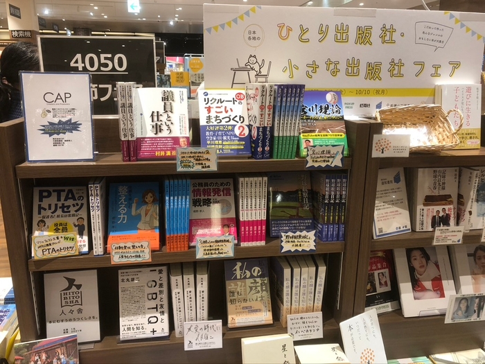 株式会社CAP(本社:神戸市須磨区緑ヶ丘1ー8−21、代表取締役:樫野孝人、以下CAP )は、「ひとり出版社・小さな出版社フェア」9月9日〜10月10日@TSUTAYA BOOK STORE ららぽーとEXPOCITY店に出店致します。