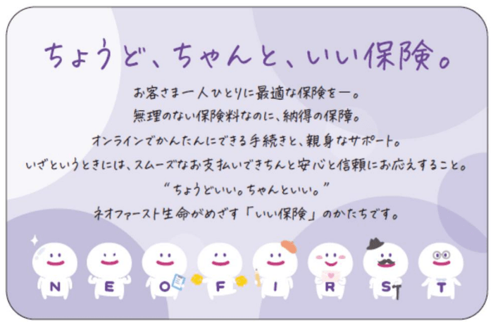 第一生命グループの一員であるネオファースト生命保険株式会社(代表取締役社長:上原 高志、以下「当社」)は、本年8月に実施した終身医療保険「ネオdeいりょう」(正式名称:無解約返戻金型終身医療保険)のリニューアルを機に、「ちょうど、ちゃんと、いい保険。」を商品ブランドコンセプトに掲げ、お客さまに対し、無理のない保険料で最適かつ充実した保障(コストパフォーマンス)とオンラインで迅速・簡単に完結する親身なサポート(タイムパフォーマンス)を体験価値としてお届けすべく取組みを進めております。