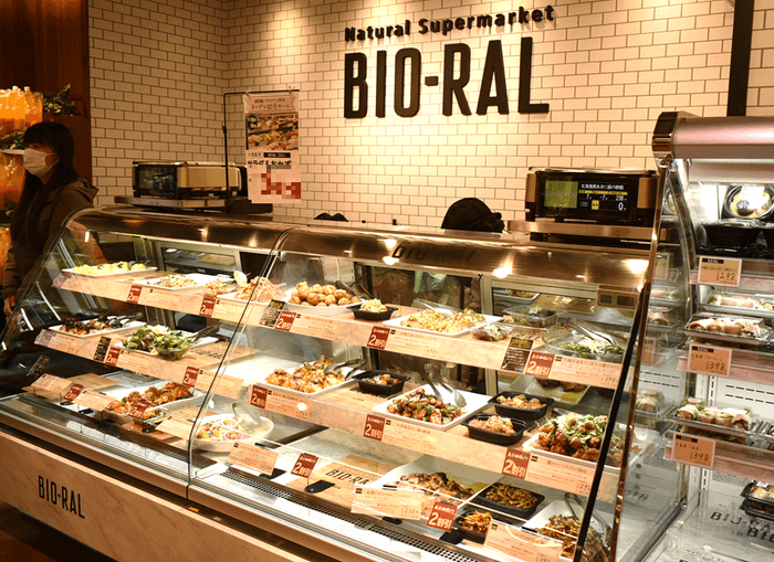 駅前店舗の立地を活かし、オーガニック原料を使用したものや食品添加物に配慮した惣菜や弁当を豊富に取りそろえます。