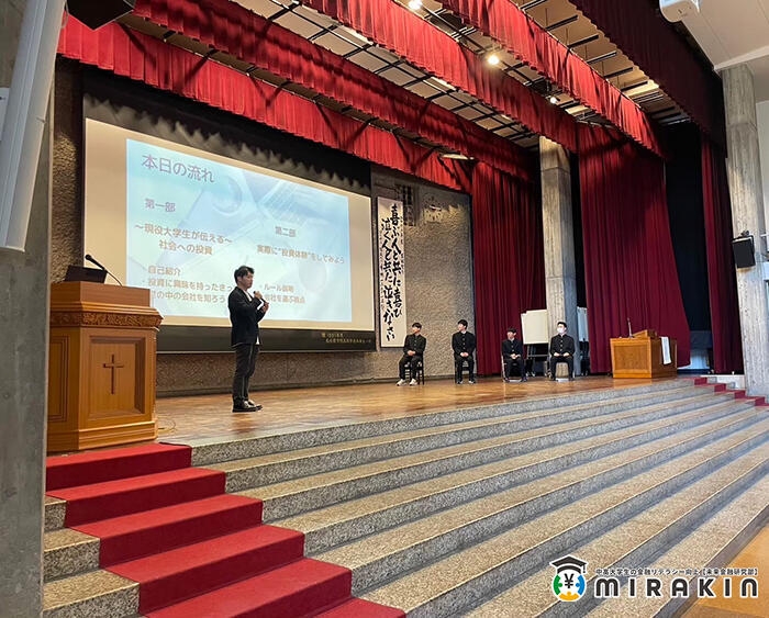 東海地方に拠点を置く上場企業に取材に出かけています。特に株や投資といった観点ではなく、中高生に向けて、企業そのものを知ってもらうことが目的の記事です。また、最近では自分の母校の高校生に向けて講演も行いました。テーマは「企業・社会を知る」です。大学生にももっと企業のことを知ってもらいたいと思い、未来金融研究会の名城大学支部の立ち上げを申請し、設立に至りました。大学生の場合、就職活動で初めて企業を研究しますが、それはあくまでも自身の就職のためですよね。そうではなく、もっと幅広く、社会や経済的な観点から企業を見ることの大切さを伝えています。その先にあるのが「株トラカップ」です。「株トラカップ」に参加することを通じて、投資について学び、年金問題や行政のあり方にまで思考を巡らせるきっかけになっていると思っています。