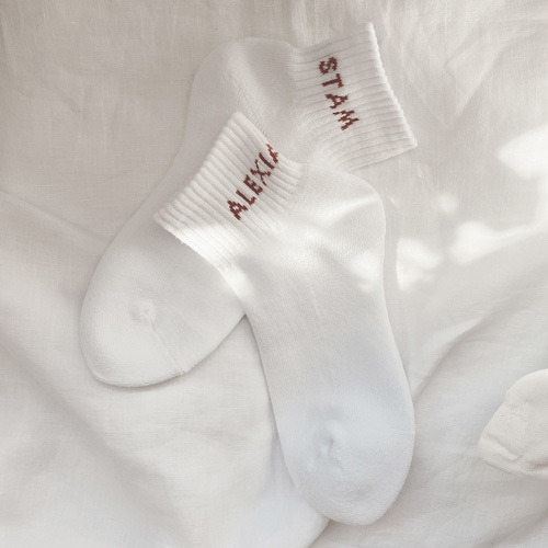 今回のオープンを記念し、ALEXIA STAM FLAGSHIP STORE OMOTESANDOでしか手に入らない限定カラーのロゴスウェットや、ノベルティーをご用意しており、店舗にて税込み20,000円以上お買い上げいただきましたお客様へ、ALEXIA STAMのロゴを落とし込んだオリジナルソックスをプレゼントいたします。(※先着順・数量限定につき、なくなり次第終了)