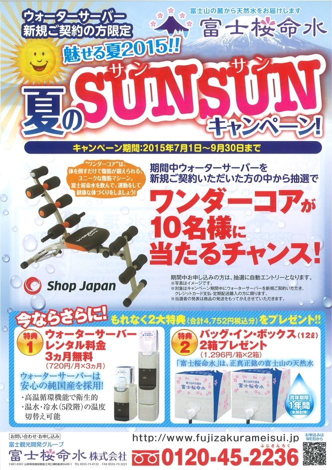 富士観光開発株式会社(本社:山梨県南都留郡富士河口湖町 代表取締役社長 志村和也)のグループ会社・富士桜命水株式会社が製造・販売する「富士桜命水」では、7月1日~9月30日までの期間中、ウォーターサーバーを新規ご契約の方を対象に「夏のSUNSUNSキャンペーン」を開催致します。