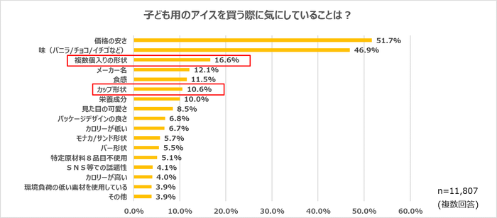 - 子ども用のアイスを購入する際に気にするポイントは「価格の安さ」や「味」のほかに、「複数個入っていること」や「カップ形状であること」も