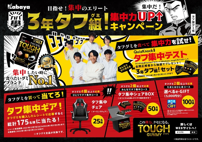 本キャンペーンは2種のキャンペーンを同時展開致します。『タフグミ』を買って応募する「タフグミを買って当てろ!タフ集中ギア!レシート応募キャンペーン」と、『QuizKnock』監修の「集中」が必要な「クイズ」に参加して豪華賞品をゲットできる「タフ集中テストキャンペーン」を実施致します。その他特設ページでは、『QuizKnock』が語る「集中」アドバイス等のコラムも展開し、受験シーズン向けて集中して勉強をするためのコツ等を掲載いたします。