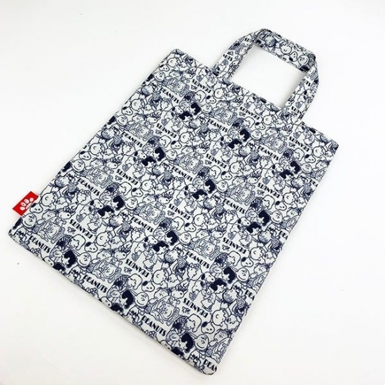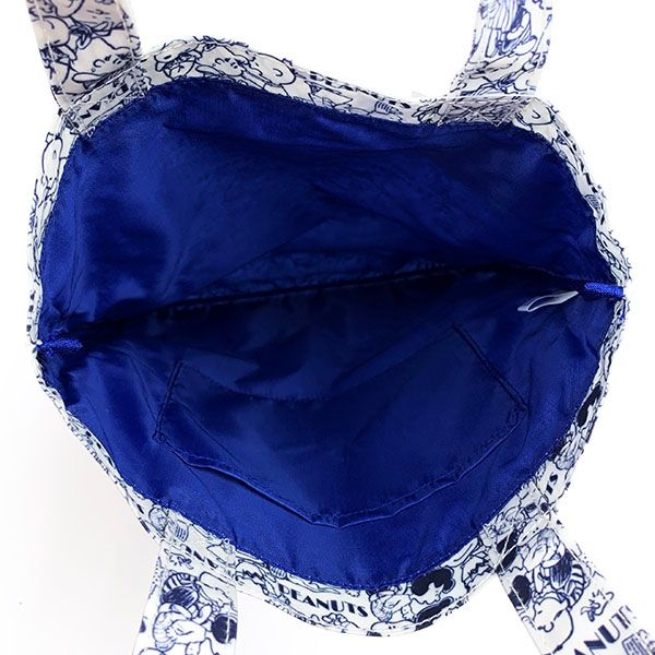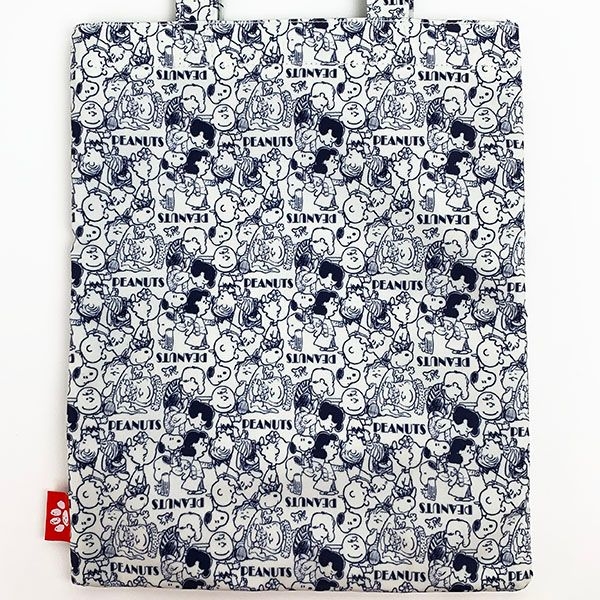 デザイン違いはこちら、ブルー系のシックなデザインです。スヌーピーや仲間たちがところ狭しと並んでいますね。通勤や通学のサブバッグにも使えそうです。