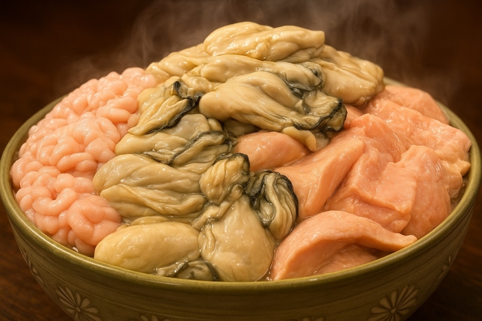 本商品は、厳選した牡蠣・白子・あん肝を贅沢に使用し、旬の野菜を豊富に取り入れた冬季限定の鍋料理です。旨みが凝縮されたスープは、厳選した日本酒との相性も抜群です。