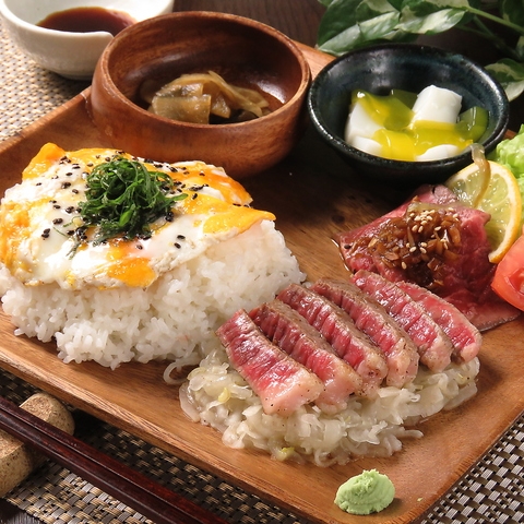 一番人気のランチプレートには、卵のっけごはん・ローストビーフ・香の物・スープ・デザートがついており、食べ応え充分な内容です。ビーフ100%のハンバークランチは、デミグラスソースとおろしポン酢の2種類から選べます。牛カツランチは、トマトたっぷりのデミグラスソースで食べるのが人気ですよ!