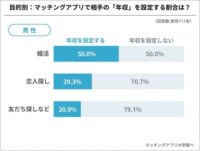 男性は婚活目的でマッチングアプリを利用している人は半数が、「相手の年収を設定する」と回答しました。恋人探しの場合は設定する割合は約3割になり、友だち探しなどの目的でマッチングアプリを利用する人は約2割程度が「年収」を設定しています。