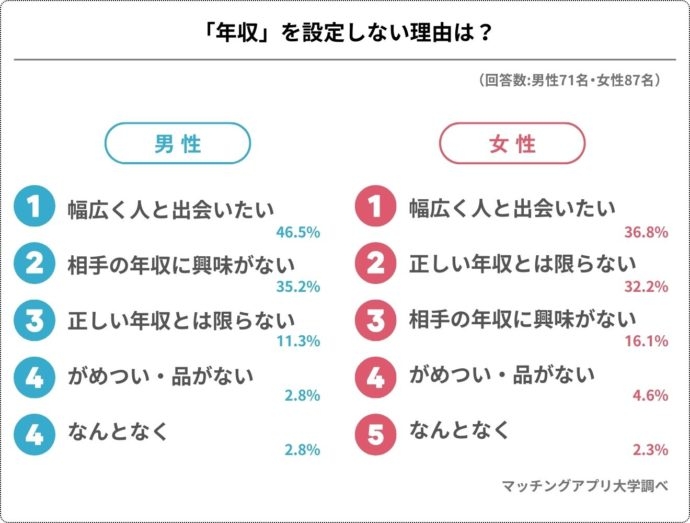 「年収」を設定しない派の理由は「幅広くいろいろな人と出会いたいから」