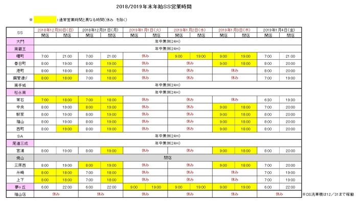 南蔵王SS、大門SS、南手城SS、福山SASS、松永南SS、尾道三成SSは年中無休(24H)