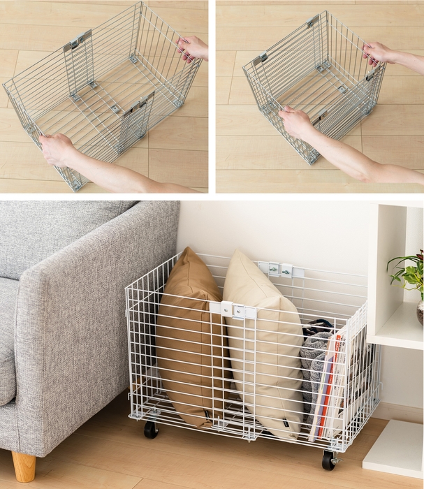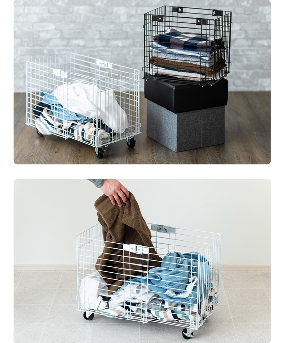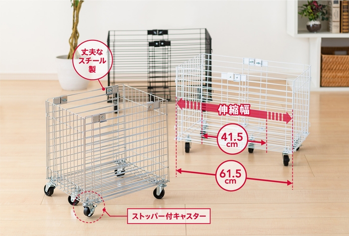 1サイズでありながら、20cmの幅調節が可能なのでコンパクトかつ、ご使用状況や環境に合わせて対応できるキャスター付きのワイヤーバスケットです。