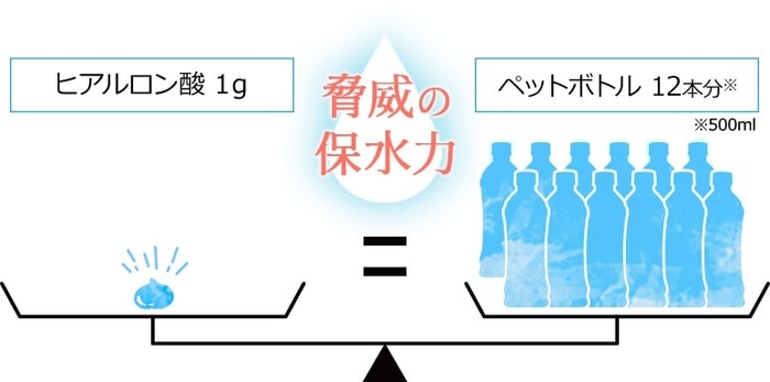 ヒアルロン酸は、強い粘度と弾力性を持つゼリー状の成分。肌にもヒアルロン酸は存在しており、ぷるぷるとしたクッションのような形状が肌の土台となっています。ヒアルロン酸が肌にプリッとした弾力を与え、ふっくらとした肌に見せてくれるのです。また、保湿力も高く、ヒアルロン酸1gに対して水分量はなんと6L!その脅威の保水力により肌の潤いをキープし、乾燥によるシワやたるみも防いでくれます。