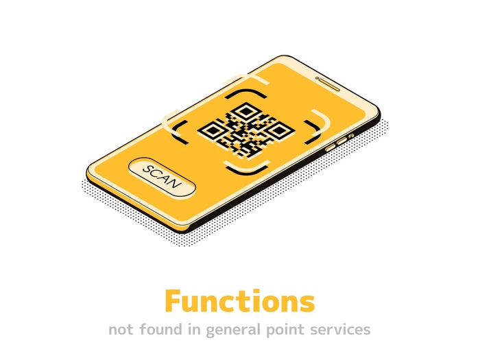 従来のポイントサービスはバーコードでのポイントの発行・使用のみですが、これにQRコードでの操作、取引履歴を導入しております。