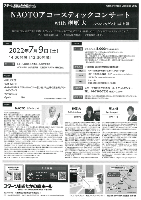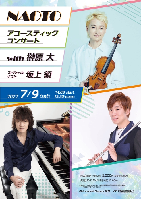『NAOTOアコースティックコンサート with 榊原大 スペシャルゲスト坂上領』が2022年7月9日(土)にスターツおおたかの森ホール(千葉県流山市)にて上演されます。チケットはカンフェティ(運営:ロングランプランニング株式会社、東京都新宿区、代表取締役:榑松 ⼤剛)にて4月15日(金)10:00より発売開始です。