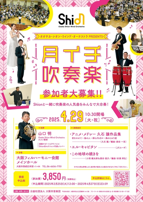 日本で最も長い歴史と伝統を誇る交響吹奏楽団のOsaka Shion Wind Orchestraを有する公益社団法人 大阪市音楽団(本社:大阪市住之江区/理事長:石井徹哉)は、月に一度、楽器を持っている方が集まって、Shionメンバーと一緒に吹奏楽曲を演奏できる人気イベント「月イチ吹奏楽」を2025年4月29日(火・祝)に開催いたします。