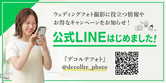 この度、ウェディングフォトスタジオを全国展開する株式会社デコルテ(本社:兵庫県芦屋市、代表者:水間 寿也、以下デコルテ)は、前撮りやフォトウェディング・撮る結婚式をご検討中の方へウェディングフォト撮影に役立つ情報をお届けするため、LINE公式アカウントを開設いたしましたのでご案内申し上げます。