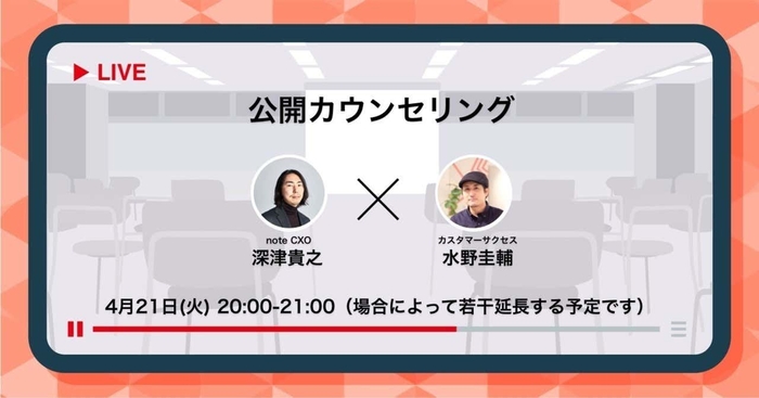 note proは、企業の情報発信のお悩みに答える「公開カウンセリング」を、4月21日(火)20時からライブ配信します。社会の変化が激しいいま企業はどのような情報発信をすべきか、実際にゲストの企業から悩みを聞きながらnoteのCXO・深津が答えます。