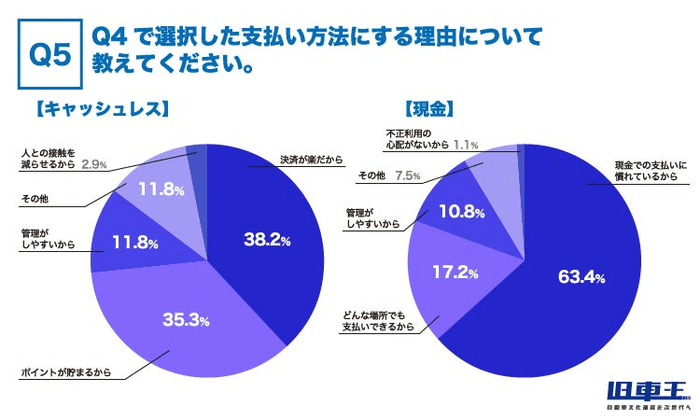 最後に、Q4で回答した支払い方法を選んでいる理由について現金派・キャッシュレス派に分けて聞いてみると、現金派で最も多かった回答は「現金での支払いに慣れているから」で63.4%、キャッシュレス派の理由は「決済が楽だから」で38.2%という回答結果になりました。
