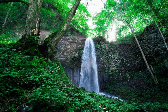 十和田八幡平(とわだはちまんたい)国立公園内に位置する奥入瀬渓流は、国の特別名勝、天然記念物、国立公園の特別保護地区に指定されています。渓流沿いを流れる滝は認知度が高く、四季折々の姿を見せてくれるため、多くの人が訪れますが、本流から離れた場所に位置するこの滝は、人知れず山の奥にひっそりと流れています。一般的なパンフレットには行き方の記載がなく、道標もない幻の滝。隠れた入口から急斜面を登り、約30分間、獣道を進まなければならないため、登山経験者や慣れている方以外はなかなか足を運ばない滝です。