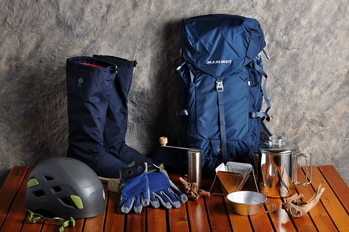 リュックサック、ヘルメット、グローブ、ウェア、スパイク付き長靴、ルーペ、
