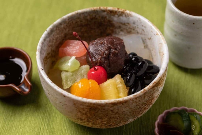 星のや東京にほど近い神田にある「福尾商店」の、昔ながらの製法で作られたこしのある寒天を使った「あんみつ」は、暑い夏にぴったりの甘味です。星のや東京玄関前にある星のや広場で、風鈴の音を聞きながら、あんみつを食べ、涼むのがおすすめです。