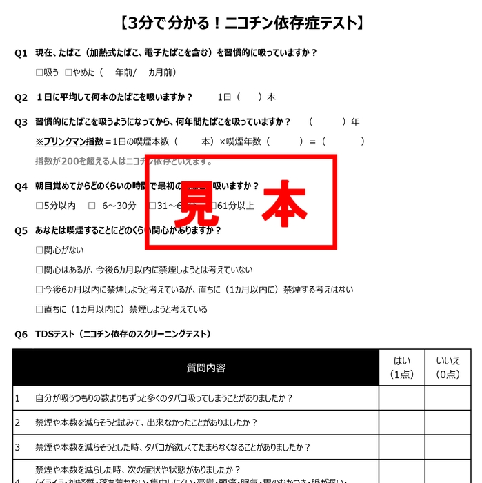 ・ブリンクマン指数(1日の喫煙本数×喫煙年数)200以上、かつTDSテスト(ニコチン依存のスクリーニングテスト)の合計点数が5点以上の方は、『ニコチン依存症』の疾患者です。