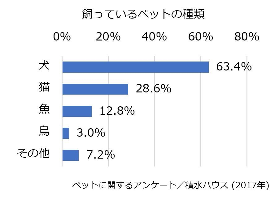 積水ハウスの調査によると、飼っているペットで最も多かったのは「犬」で63.4%でした。次が「猫」で3割弱、続く「魚」は約1割という結果になりました。