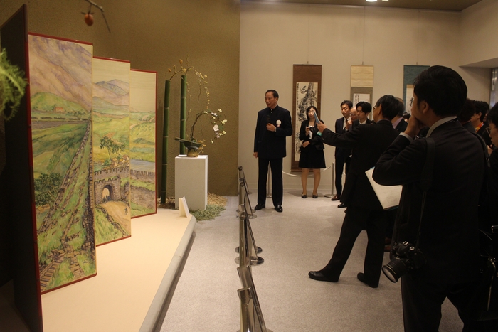 オープニングセレモニーには中国側37人を含め約80人が出席。虎次郎の孫で同美術館の児島塊太郎館長が「一昨年に計画してから開催まで長い道のりで、感無量です。ごゆっくりご覧ください」、上海市書法家協会の張偉生副主席は「100年前に蒔いた友情の種が、中日両国民の間で咲き、多くの実をつけている。成功を祈念します」と挨拶され、加計学園の加計役副理事長、張副主席らがテープカットを行いました。