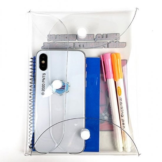 クリアマルチケースはスナップボタンで開閉できるようになっています。上にも下にもボタンが付いているので、ケースを手に取ったときに好きな方向からガバッと中身を取り出せるのが便利です。