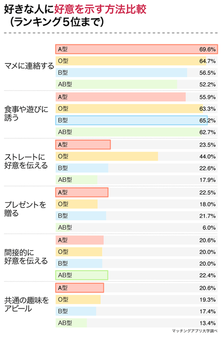 好きな女性にどのような形で好意を示すか聞いたアンケートでは、A型とO型は「マメに連絡する」、B型とAB型は「食事や遊びに誘う」が一番多いという結果でした。