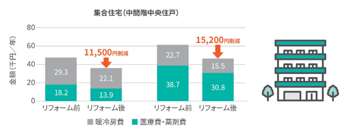 ●集合住宅は隣接する住戸の影響で、戸建て住宅より温度変化が小さく、暖冷房費・医療費・薬剤費ともに少なくなるため、窓リフォームによる削減効果は戸建て住宅のほうが大きくはなるが、戸建て住宅と同様に、集合住宅も夫婦60代の2人世帯の方が、削減効果が大きい。