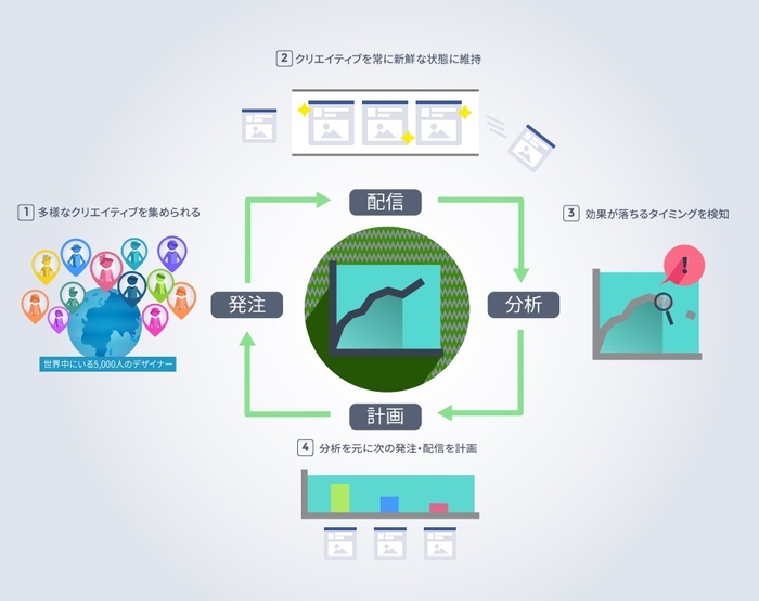 また、高い専門性と経験を兼ね備えたグローバルなデザイナーのネットワークを利用し、ローカライズされた高品質なクリエイティブを迅速かつ大量に納品することで動画広告クリエイティブを最適化します。