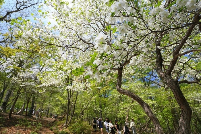 例年5月上旬頃から咲き始め、最盛期の5月中旬頃には一面の可憐な純白の花をご堪能できます。ゴンドラでの約10分間の空中散歩では、眼下に広がるゴヨウツツジと那須高原の壮大な景色を堪能し、山頂駅到着後は木々の間を縫うように整備された散策路を木洩れ日を浴びながら歩く、非日常的なのんびりとした時間をご提供致します。