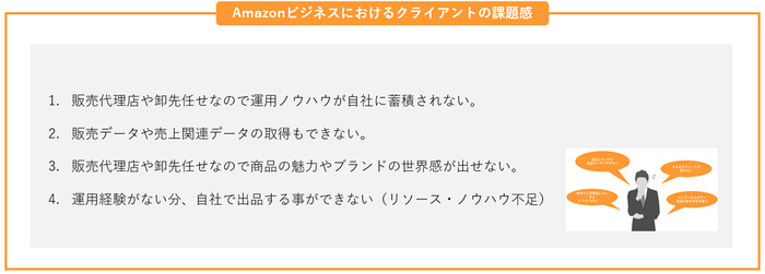 ② 特にAmazonに関しては商売形態上、販売や運営自体を卸先や代理店に任せているケースも多い。そのためノウハウやデータの蓄積も難しい。