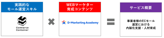 「Commerce Container」のコンサルティングサービスで培った実践的なECモール運営スキル・ノウハウと、DMAの動画コンテンツ授業を掛け合わせる事で、内製化支援・人材育成をサポートいたします。