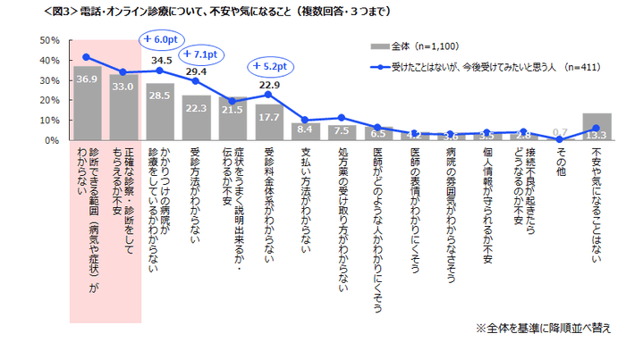 電話・オンライン診療の不安点や気になることは、「診断できる範囲がわからない」「正確な診察・診断をしてもらえるか不安」といった診断・診察範囲への不安が大きい。<図3>