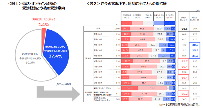 今回は、病院へ行くことの抵抗感、電話・オンライン診療の受診経験・受診意向、不安点などについて分析しています。