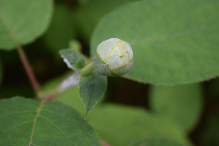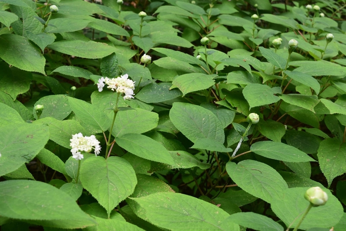 タマアジサイが開花しました。球形のつぼみが特徴の系統で、和名と学名の由来にもなっています。遅咲きの系統で、ほかのアジサイが咲いている頃には大きく玉のようなつぼみを楽しむことができます。その玉のようなつぼみがほころび、白くて可憐な花を咲かせ始めています。休憩所兼売店の裏手にてご覧いただけます。つつじ茶屋や滝見茶屋などの日陰で休憩しながら園内散策をお楽しみください。
